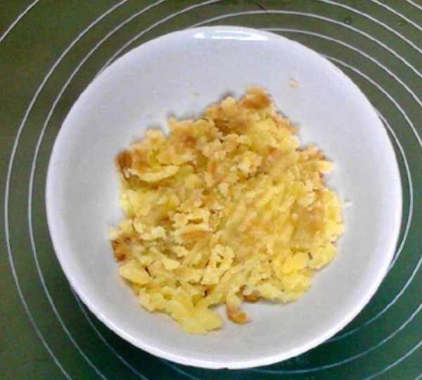 第3步、取100克土豆泥,加入油、糖拌勻。