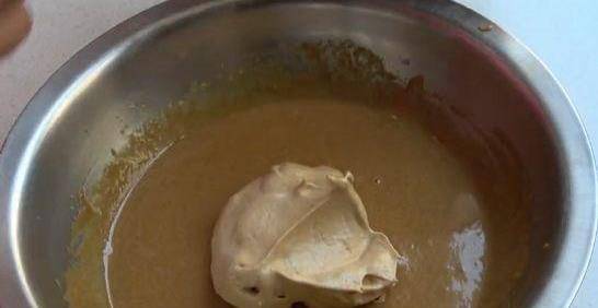 把打發的蛋白和蛋黃糊攪勻,蛋白要分3次放。