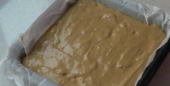 模具裡鋪上油紙,把翻拌均勻的面糊倒入模具裡,再把它抹平。