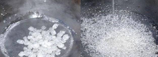 另起鍋添入一勺清水,放入冰糖,用勺子輕輕敲碎,連續攪拌,熬至黏稠狀時離火,加入少許蜂蜜,攪拌均勻。