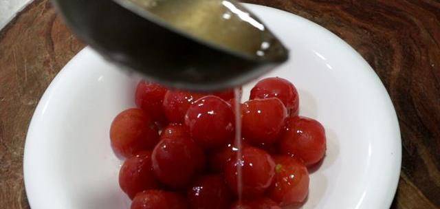 然後把糖汁均勻地澆在千禧果上面。