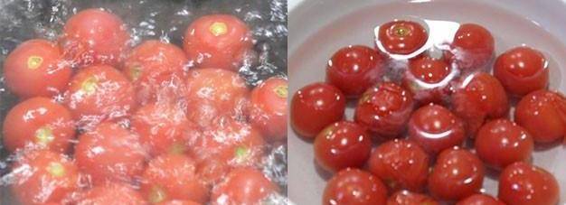 起鍋燒水,水開後倒入千禧果,用勺子推動幾下,使千禧果受熱均勻,煮兩分鐘左右,撈出放入涼水盆中。