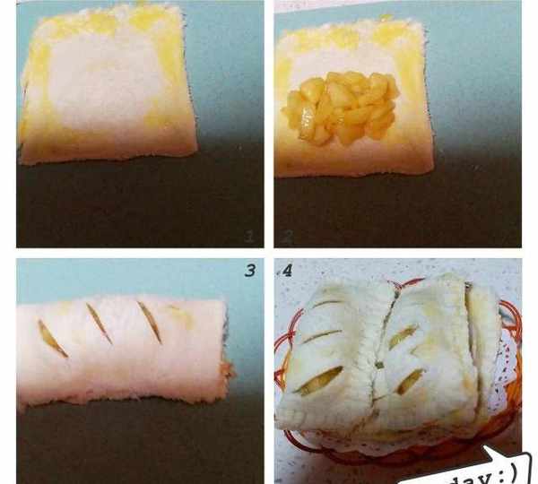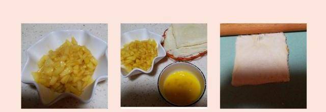 9.在搟好的吐司片四周抹上蛋液,上方用刀子斜著劃三條口子。