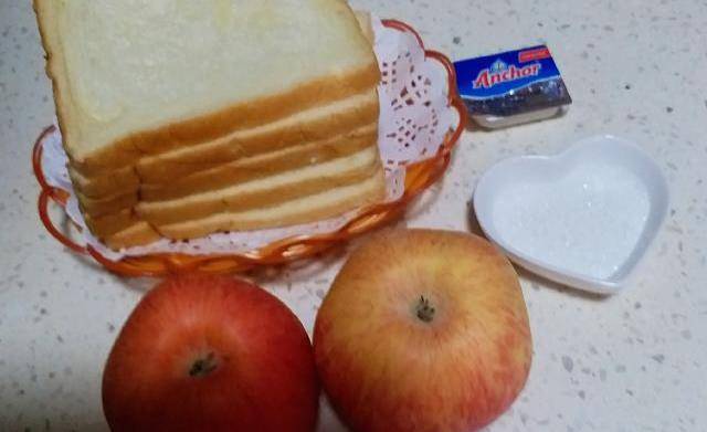 吐司六片,蘋果350克,黃油10克,白糖10克,雞蛋1個,淀粉10克。