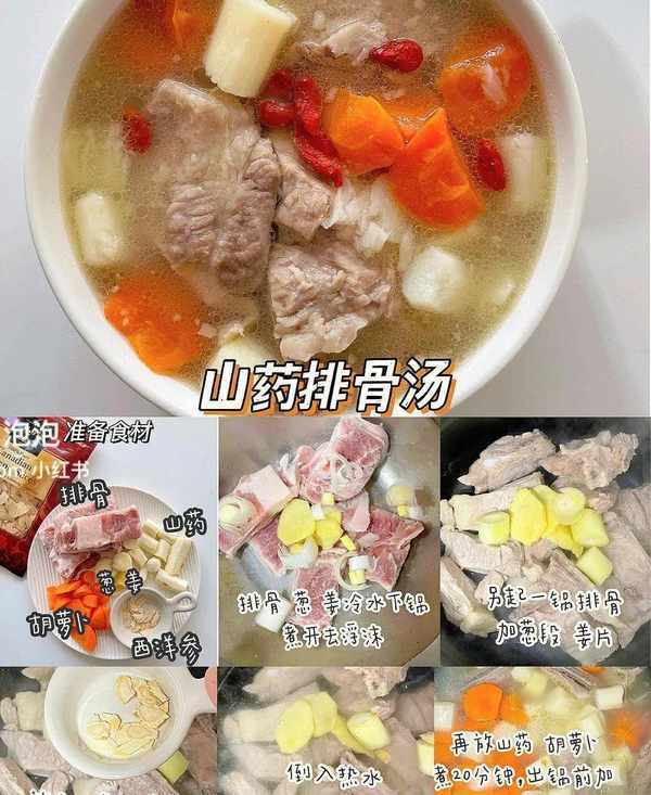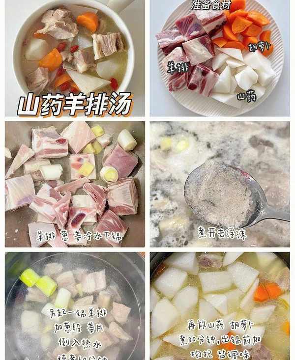◆烹飪方法:鍋中放入羊排、蔥、薑,冷水煮開去浮沫。然後另起一鍋,羊排加蔥段、薑片倒入適量熱水燉煮60分鐘,再放入山藥、胡蘿卜煮30分鐘,出鍋前加枸杞、鹽調味,即可享用。