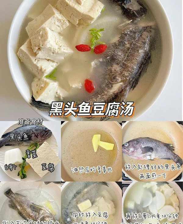 ◆烹飪方法:鍋中倒油,待油熱後炒香薑片,放入處理好的黑頭魚,兩面煎一下。倒入適量的熱水,放入豆腐塊,煮開後轉中小火煮30分鐘,再放入白蘿卜繼續煮10分鐘,出鍋前放枸杞、加鹽調味 即可。