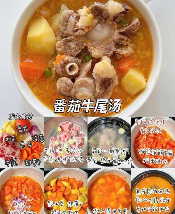 ◆烹飪方法:將準備好的牛尾、蔥段、薑片、冷水下鍋焯水,牛尾溫水洗凈。另起一鍋,將牛尾,蔥段、薑片加熱水,中小火煮2個小時,再放入番茄濃湯繼續煮30分鐘加鹽調味即可。