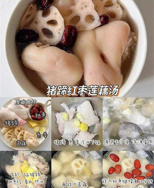◆制作方法:豬蹄洗凈處理幹凈,放入鍋中,加蔥、薑煮開去浮沫。另起一鍋,洗凈浮沫的豬蹄加蔥段、薑片,多加一些熱水,煮50分鐘左右,然後放入紅棗,蓮藕繼續煮30分鐘,出鍋前加枸杞、鹽調味即可出鍋。