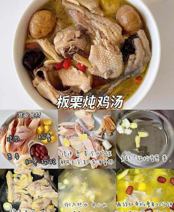 ◆烹飪方法:將準備好的雞、蔥、薑冷水煮開焯水去浮沫,溫水洗凈。另起一鍋,鍋中油熱後炒香蔥薑,放入雞塊炒一下,然後倒入適量熱水,中小火煮40分鐘,再加入紅棗和板栗繼續煮20分鐘,煮好後放上枸杞,加鹽調味即可。