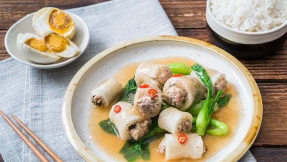 白玉蘿卜盅,將豬肉餡釀入白蘿卜盅內,蒸熟,澆汁,外表晶瑩剔透,紅白相間,蘿卜吸取瞭肉的湯汁,鮮甜可口,是一道不錯的食療佳品哦。在裝有肉泥的碗中加入鹽、生抽、料酒、白胡椒粉、白糖、牛肉粉等調味品,順一個方向攪拌,一邊攪拌一邊加入蔥薑花椒水,攪拌至有粘性。蒸蘿卜盅的時間,要根據蘿卜的厚度來決定。豬肉最好選擇三分肥七分瘦的,要用刀剁成肉泥,剁至有粘性才好。.白蘿卜切掉的邊角料可以和排骨一起,燉個湯,秋季幹燥,多喝湯水,更加滋潤。西蘭花入開水中焯燙時間不要太長,水中加點鹽和油,能使西蘭花色澤碧綠爽脆。.西蘭花由於生長結構,很容易藏匿小蟲和殘留農藥,一定要用淡鹽水浸泡清洗後才能食用。