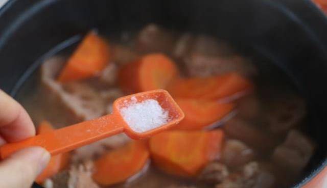 6、大約40分鐘後,加入胡蘿卜,放入1勺鹽,繼續燉煮15分左右即可;