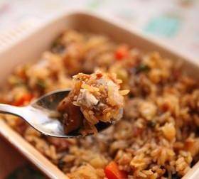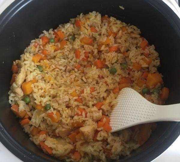 4、電飯煲正常煮飯,到米飯熟瞭之後,將炒制好的材料均勻鋪在米飯上繼續燜十幾分鐘。