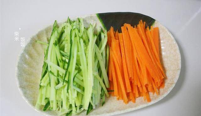 3,準備一些黃瓜絲和胡蘿卜絲,如果吃不慣生胡蘿卜的味道,可以將其用開水燙半分鐘。