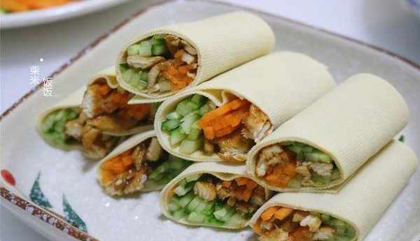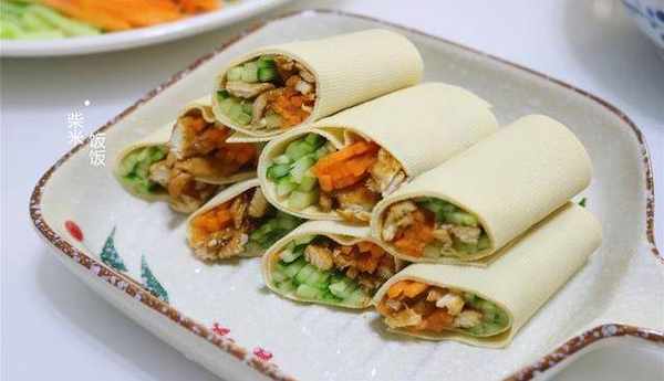 豆腐皮卷上肉絲和蔬菜,營養好吃,老少皆宜。關鍵少油低熱量,多吃也不會胖,特別適合晚餐吃。