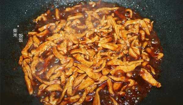5,加入半勺老抽、1勺生抽、半勺蠔油、一勺甜面醬、半勺白糖調味。大火炒出醬香味,繼續炒至湯汁變稠,肉絲炒熟出鍋。