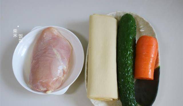 【食材】豆腐皮、雞胸肉、黃瓜、胡蘿卜、老抽、生抽、料酒、淀粉、白糖