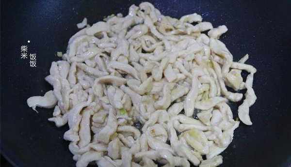 4,熱鍋涼油,放入薑絲炒香,然後倒入雞肉絲,大火炒至肉絲變色。