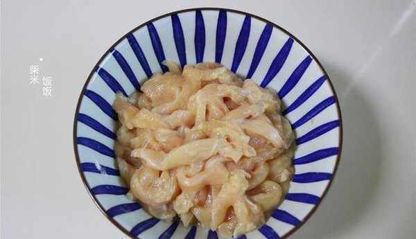 1,雞胸肉一塊,洗凈後切成絲。加入一勺料酒、半勺淀粉拌勻醃制10分鐘。加料酒可以去腥,加淀粉可以使肉絲的口感更滑嫩。
