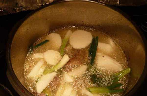 (5)將羊肉、山藥、蔥、薑放入鍋中。
