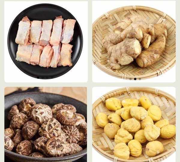 第4步:材料都準備好瞭,把雞撈出來,放電飯煲裡,再把薑,板栗,童花菇一起放進去,加水高出材料2-3cm即可。按煲湯鍵煲一個小時,加適量鹽調味,然後按保溫鍵,一直燜1-2小時就差不多瞭