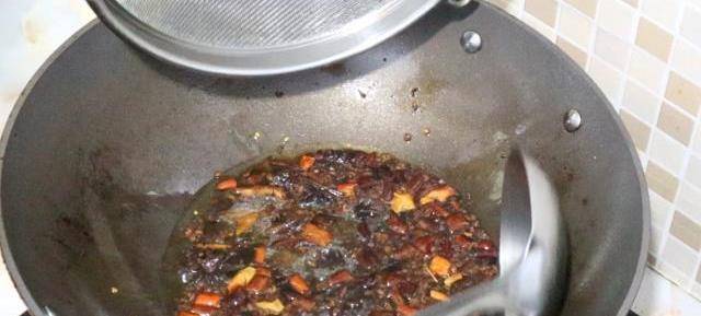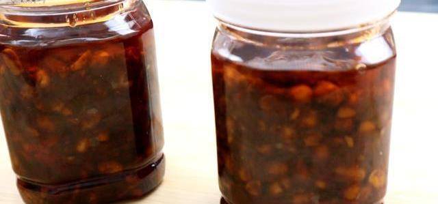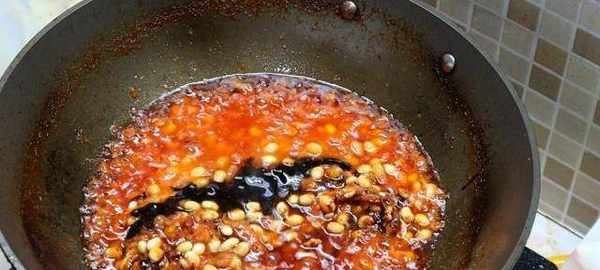 第四步:煮鍋中的水分差少時,加入食鹽10克、甜醬15克、高白酒15克,用小火繼續煮,(不斷攪拌,防止做鍋)上面開一層油也不差,盛盤曬幹放入幹凈的瓶子裡,放入豆醬中密封油保存,常溫下一年都不錯。