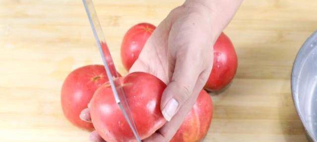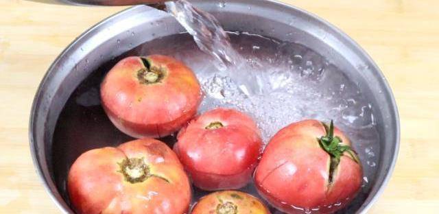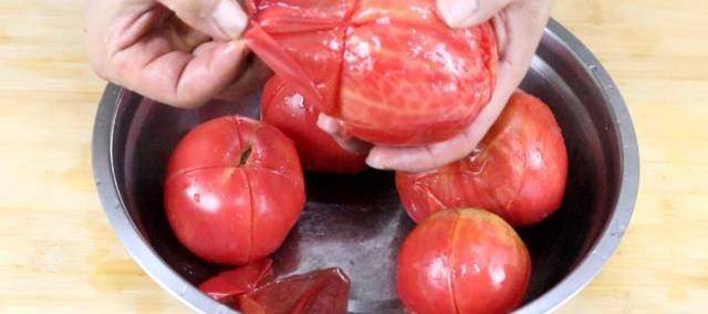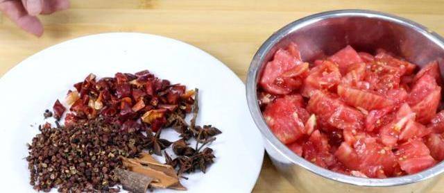 第2步:準備5個西紅柿,上面用十字刀把熱水倒入盆中加熱3分鐘,3分鐘後將加熱過的番茄皮剝下來,切成小塊放在盆裡,準備一些青椒、桂皮、八角、辣椒幹,用水洗凈,控制幹燥水分。