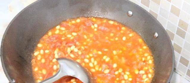 第三步:在鍋裡放入適量色拉油,將準備好的大材料放入鍋中,用小火油炸大材料,不要油炸,放入煮好的大豆和切好的西紅柿塊,用中火煮20分鐘左右。