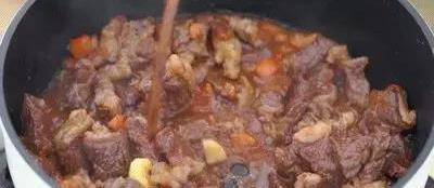 6、加入啤酒,沒過牛腩後,再加入兩片香葉大火煮開後,小火燜50-60分鐘,如果喜歡吃更軟一點的牛腩,可以再燜20分鐘,但一定要查看鍋中的水量,避免糊鍋哦。