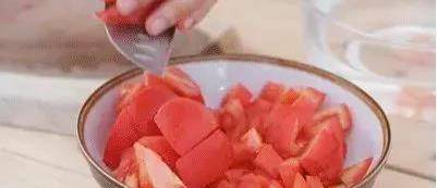 3、將番茄一切兩半,一半切大塊,一半切小塊,