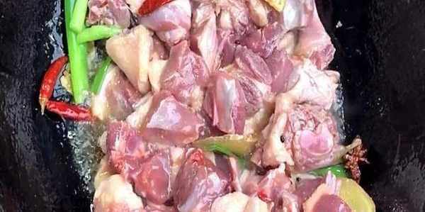4、炒出香味以後,把剁好的鴨塊放入鍋中煸炒,不停的翻動煸炒,把鴨子裡面裡面的水分全都炒幹(這樣燉出來的鴨子沒有腥味)。