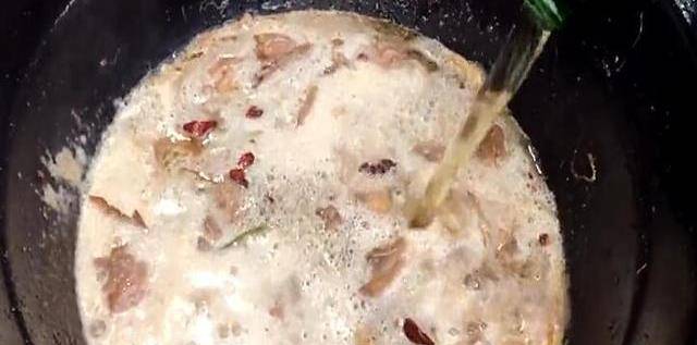 7、倒入啤酒攪拌均勻以後,放入少許食鹽、少許白糖、少許老抽調色,攪拌均勻以後蓋上鍋蓋,小火燉煮40分鐘。