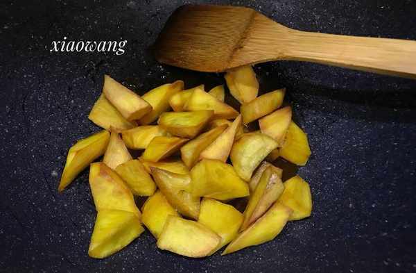 6. 糖熬好,下入炸好的地瓜塊,快速翻炒,讓糖汁兒均勻的裹在地瓜上即可。