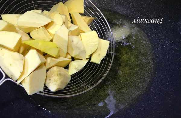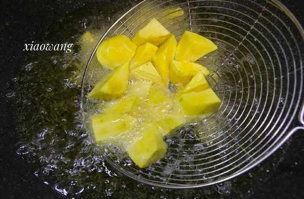 2. 炸至地瓜。鍋中倒入適量色拉油,將油溫燒至6成左右,冒煙的時候下入地瓜塊。