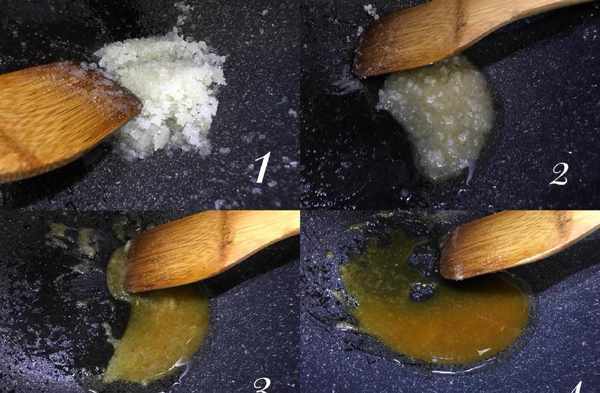 5. 熬糖一直保持小火,分為四個階段,如圖1、2、3、4所示,過程較長。糖熬好呈現出來的顏色是深焦糖色。