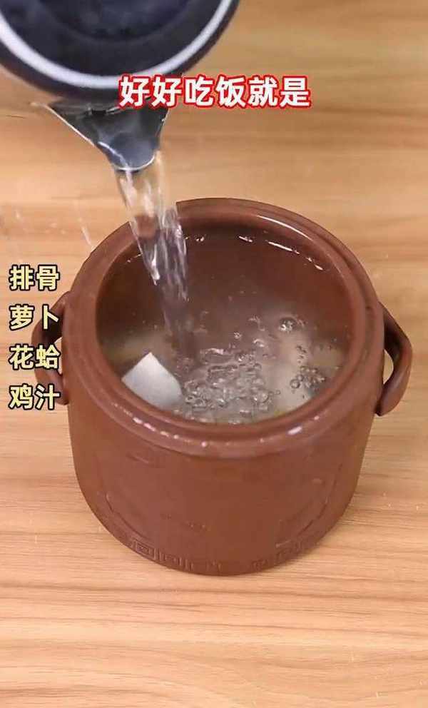 現在開始制作高湯,準備一個燉盅,然後將排骨、蘿卜、花蛤、雞汁放入燉盅。加入適量的水。