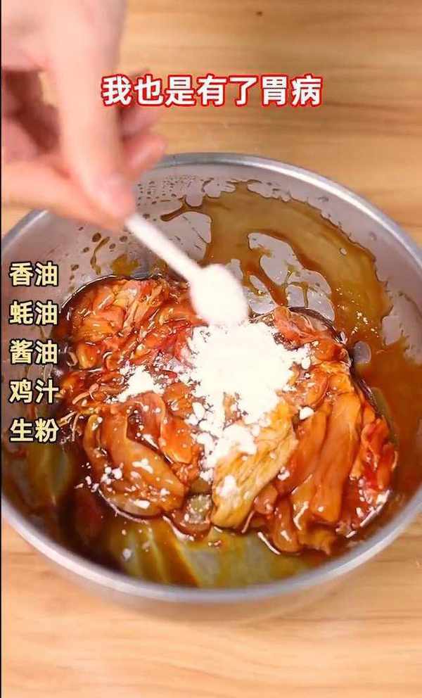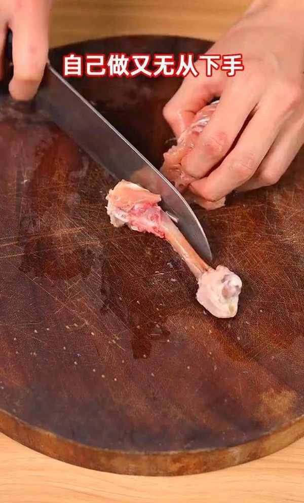 首先將從農貿市場不要錢的雞腿進行剔骨處理,然後將肉放入容器內進行醃制,放入鹽、香油、蠔油、醬油、雞汁、生粉。
