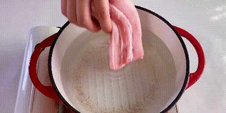 3、郫縣豆瓣醬一定要有,三層肉切薄片,中火炒出焦香,這樣味道和口感都好。