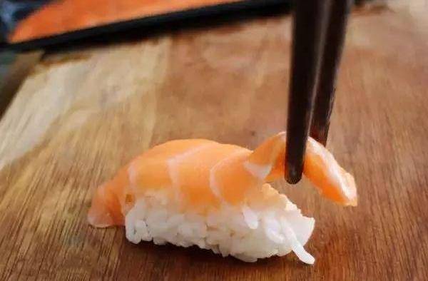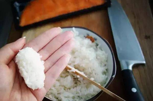 4.三文魚手握的做法:取一些米,用手握成團,長條形,中間用拇指壓出一個小洞,這是給壽司呼吸的孔,它會讓壽司的口感更美味。