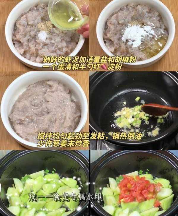 蝦仁(蝦滑)、絲瓜、番茄、蔥薑