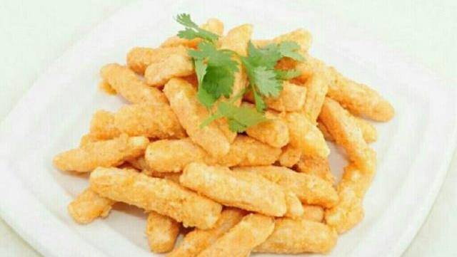 2.鍋裡熱油6成時,放入裹上粉的南瓜條。炸至定型後,改小火炸至熟透。再升高油溫,炸至金黃酥脆,倒出控油。接著鍋留底油放入黃油熱融化,放入咸蛋黃碎煸炒起泡沫時。放入南瓜條翻炒均勻即可。