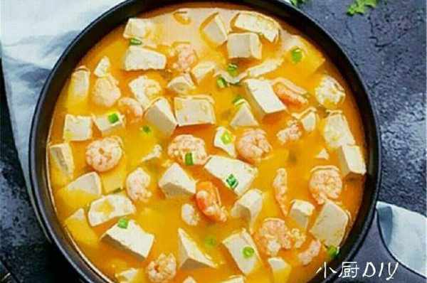 2.鍋裡熱油放入咸蛋黃煸炒起泡沫時,倒入適量的雞湯。放入蝦仁,蟹柳粒和青菜粒煮熟。放入調味料和豆腐,燜至入味時,撒入蔥花,勾芡即可出鍋。