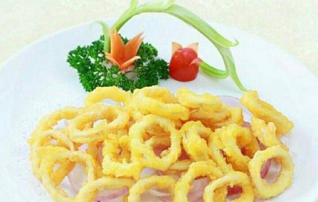 2.鍋裡熱油6成時,倒入裹好粉的鮮魷。炸制金黃色時,倒出控油。鍋留底油,放入黃油熱融化。倒入咸蛋黃碎煸炒起泡沫時,放入炸好的鮮魷翻炒均勻即可。