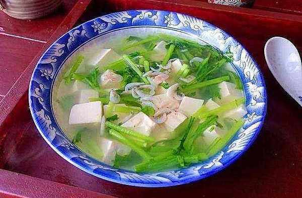 茼蒿250克、豆腐1塊、蝦皮1湯匙、香油1湯匙、鹽適量、薑1片