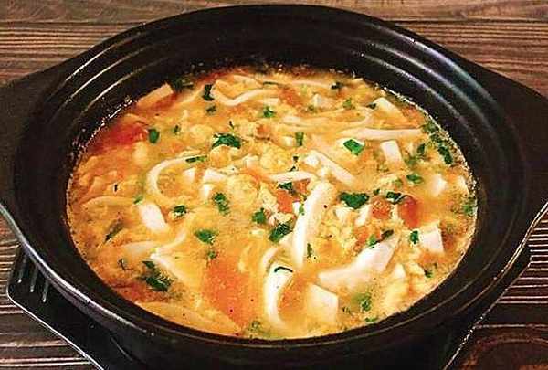番茄去皮切碎。砂鍋內加少量油,倒入番茄丁,小火炒2分鐘。砂鍋內加水、濃湯寶煮沸。南豆腐切絲,加入砂鍋內燉煮。雞蛋打散,待水煮沸後倒入砂鍋。水滾開後撒上香菜碎出鍋。