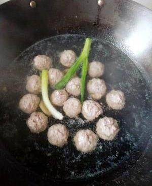 燒小半鍋熱水,水裡放兩片薑,兩根蔥,倒半勺料酒,水沸騰瞭轉成小火,再汆丸子,記住,汆丸子不可開大火,否則會把丸子打散。