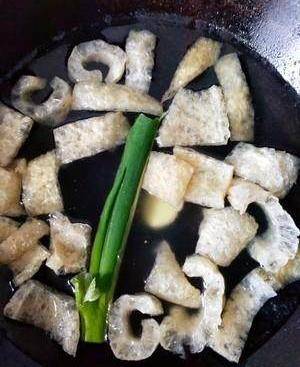 另起一鍋清水,放進蔥薑,料酒,把泡發好的肉皮煮20分鐘。這個湯是不要的,倒掉,肉皮出鍋再次清洗一遍。(肉皮經過燉煮,已經完全去除瞭原先的油脂,因為大傢都知道肉皮是油炸食材,所以幹肉皮摸起來都是油的,這樣操作既去瞭肉皮中的老油,又使肉皮變得軟糯,口感更佳。)