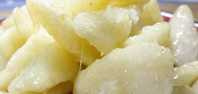 拔絲山藥做好後,稍微等個一兩分鐘,就可以用筷子夾起來,這時候就會出現像蓮藕一樣的絲,真的是一道好看又好玩的菜肴。不過第一次制作的時候,大傢要註意熬糖的時間,千萬不能熬得過,那樣拔絲山藥的外層糖濃度太大,就像吃糖葫蘆一樣會感覺很粘牙,如果戴著假牙的話,一下就能把假牙給粘掉瞭。