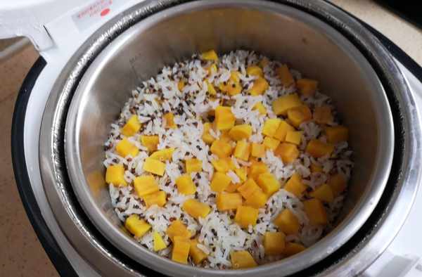 4、將洗凈後的藜麥和粳米放入臻米脫糖電飯煲中,加入不超過米面一厘米的清水,然後將紅薯丁平鋪在表層。
