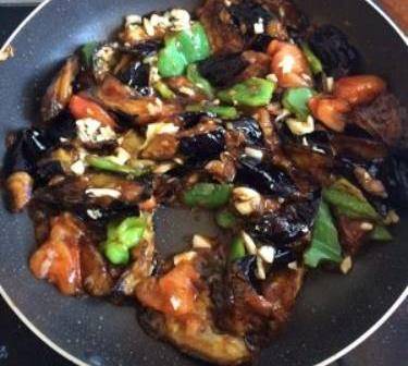 第四步,將蔥薑下入鍋中爆香,然後加入西紅柿和青椒,翻炒至5成熟,再加入茄子繼續翻炒。翻炒均勻後,加入調好的料汁,裹均勻後,再放蒜炒兩下就可以瞭。