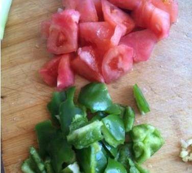 第三步,將西紅柿、青椒和調料都切好備用。然後取個碗加入老抽、生抽、醋、糖、鹽、淀粉和水,然後攪拌均勻備用。